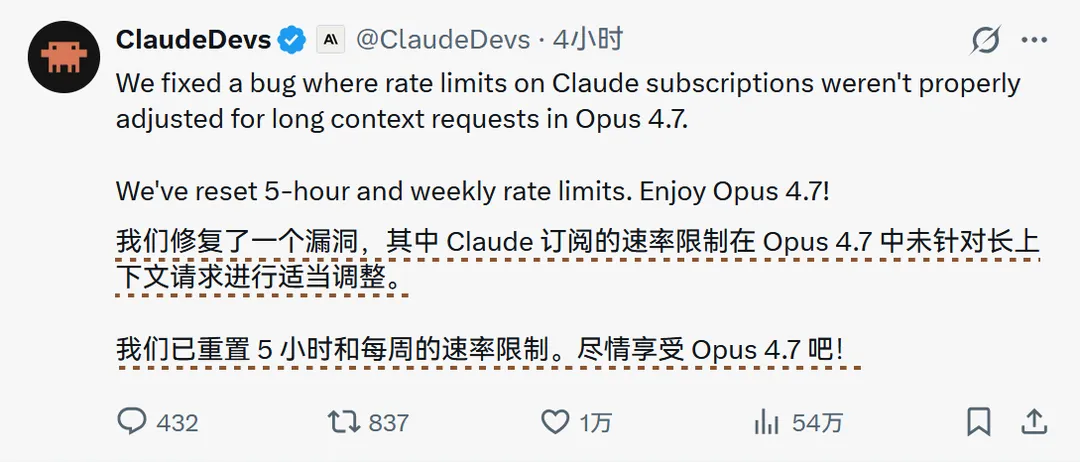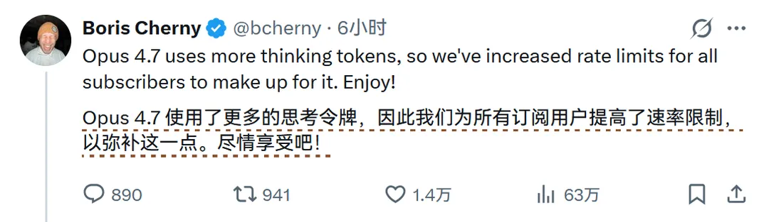tokenizer、介于high与max之间的xhigh推理力度等级,并在 API 侧开启了任务预算功能的公测。API 定价与前代持平。为应对新模型增加的 token 消耗,Anthropic 已永久上调所有付费订阅用户的额度作为补偿。