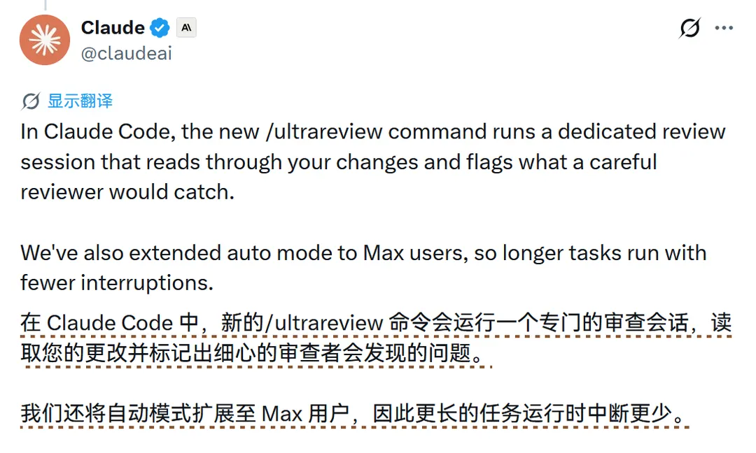 ultrareview命令能自动捕捉代码审查中的潜在问题,同时auto mode已向 Max 用户提供。Claude 桌面应用新增了Bluetooth API,能构建与 Claude 交互的硬件设备。此外,Anthropic 重置了订阅用户的速率限制。