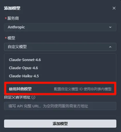 baseURL配置功能。用户添加模型时需输入模型 ID 及完整的网络地址。