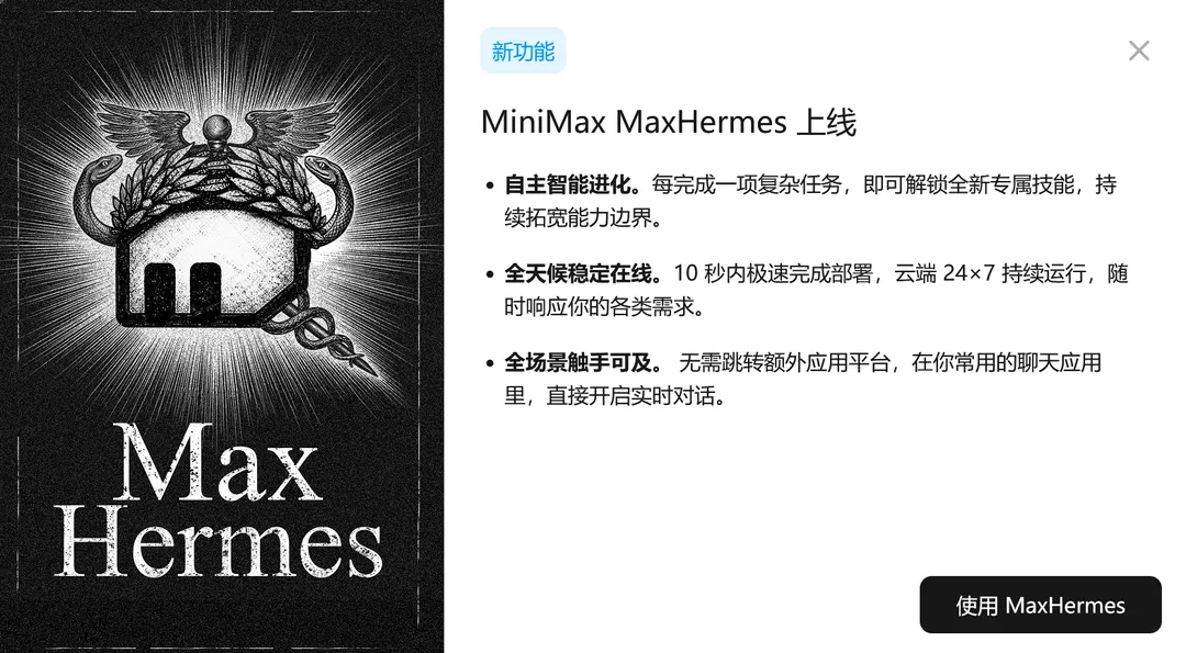 Hermes Agent的云端沙箱智能体 MaxHermes,官方称其为能自主提炼并迭代技能的自我进化AI助手,并支持用Token Plan抵扣任务消耗。