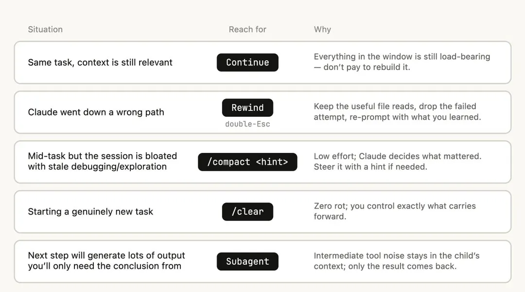 /rewind回退纠错,利用/compact和/clear精简冗长对话,指派 Subagents 在独立环境中处理仅需最终结论的繁杂任务,并在开启全新任务时果断新建会话。