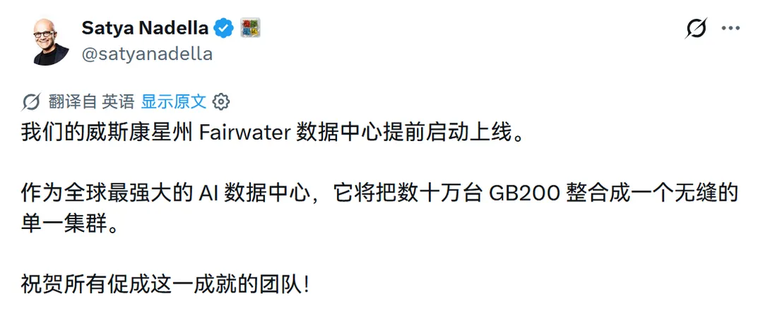 微软宣布威斯康星州 Fairwater 数据中心提前上线,官方称其为全球最强 AI 数据中心,包含数十万块
