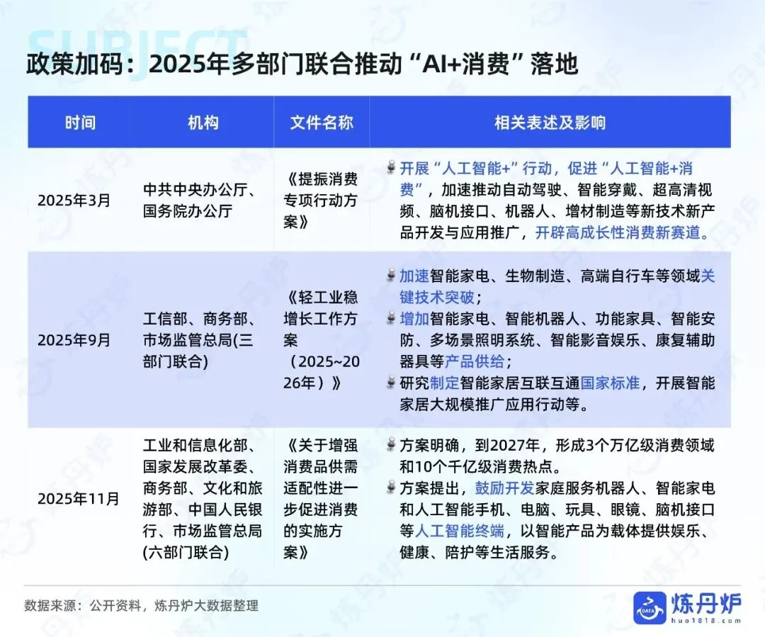 政策端,2025年国家多部门密集出台政策推动“AI+消费”落地。3月,中共中央办公厅、国务院办公厅《提振消费专项行动方案》提出开展“人工智能+”行动,加速推动自动驾驶、智能穿戴、超高清视频、脑机接口、机器人等新技术新产品开发与应用推广;9月,三部门联合发布《轻工业稳增长工作方案》,增加智能家电、智能机器人等产品供给;11月,六部门联合发文,明确到2027年形成3个万亿级消费领域和10个千亿级消费热点,鼓励开发人工智能手机、电脑、玩具、眼镜、脑机接口等人工智能终端。