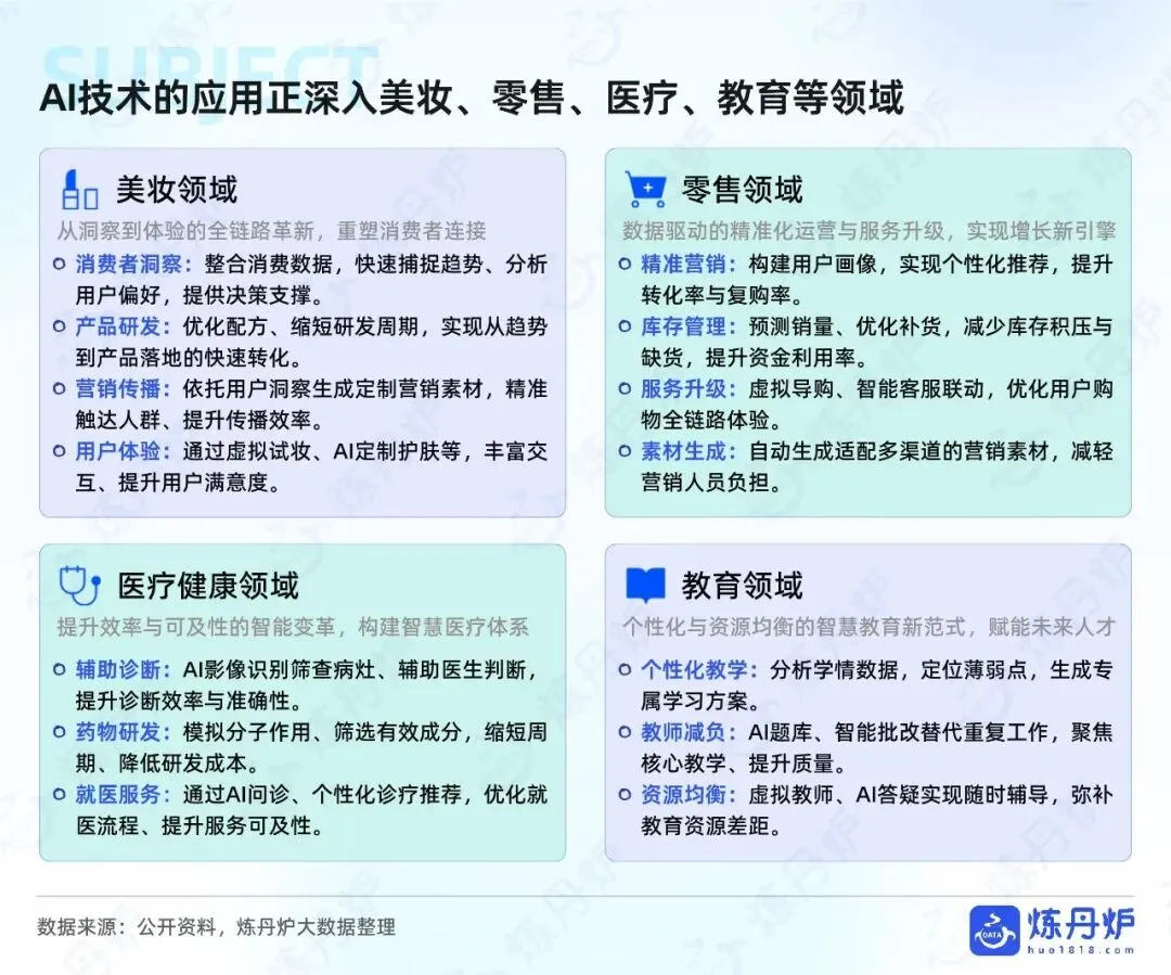 技术层面,生成式AI驱动数据价值重构,消费数字化从记录行为升级为理解与创造。美妆、零售、医疗健康、教育等领域均实现从洞察到体验的全链路革新:美妆领域整合消费数据快速捕捉趋势,优化配方缩短研发周期,依托用户洞察生成定制营销素材,通过虚拟试妆等丰富交互;零售领域构建用户画像实现个性化推荐,预测销量优化库存管理,虚拟导购与智能客服联动优化购物体验;医疗健康领域通过AI影像识别辅助诊断,模拟分子作用加速药物研发,AI问诊优化就医流程;教育领域分析学情数据生成专属学习方案,AI题库与智能批改为教师减负,虚拟教师弥补教育资源差距。