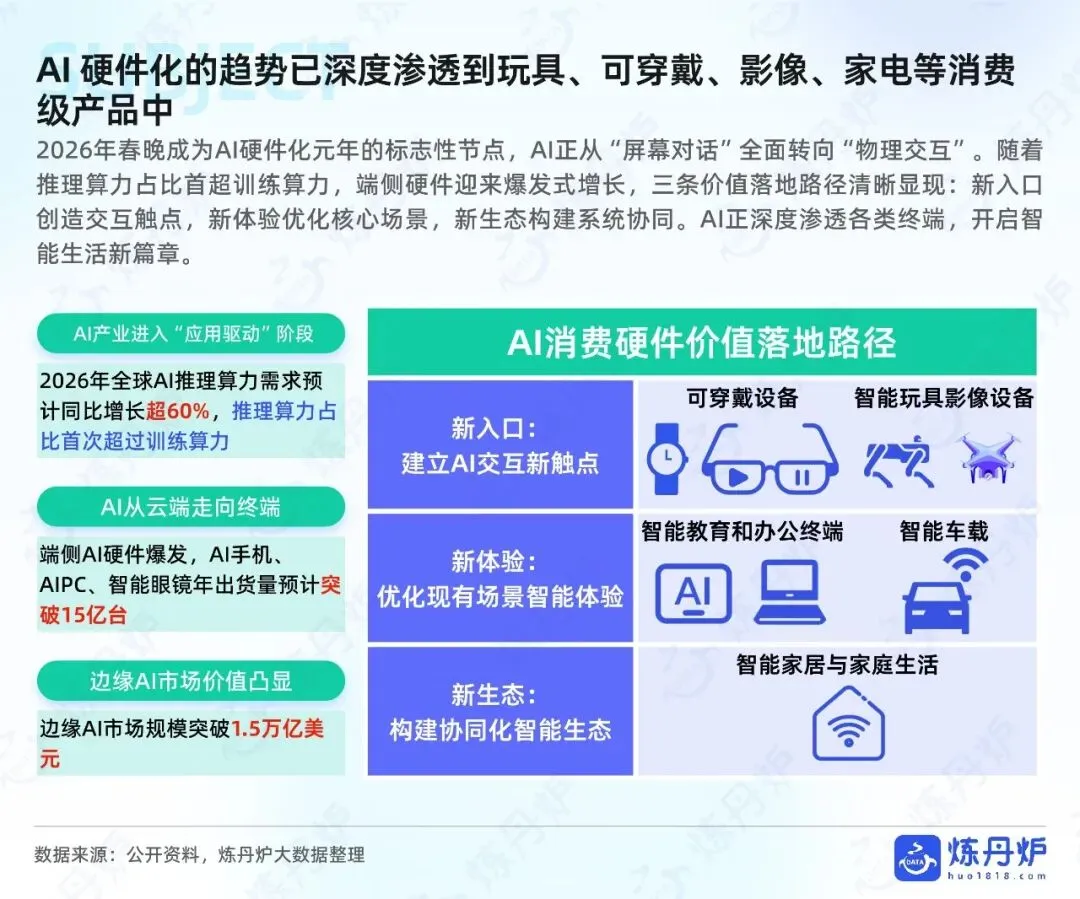 2026年春晚成为AI硬件化元年的标志性节点,AI正从“屏幕对话”全面转向“物理交互”,推理算力占比首超训练算力,端侧硬件迎来爆发式增长,三条价值落地路径清晰显现:新入口创造交互触点,新体验优化核心场景,新生态构建系统协同。