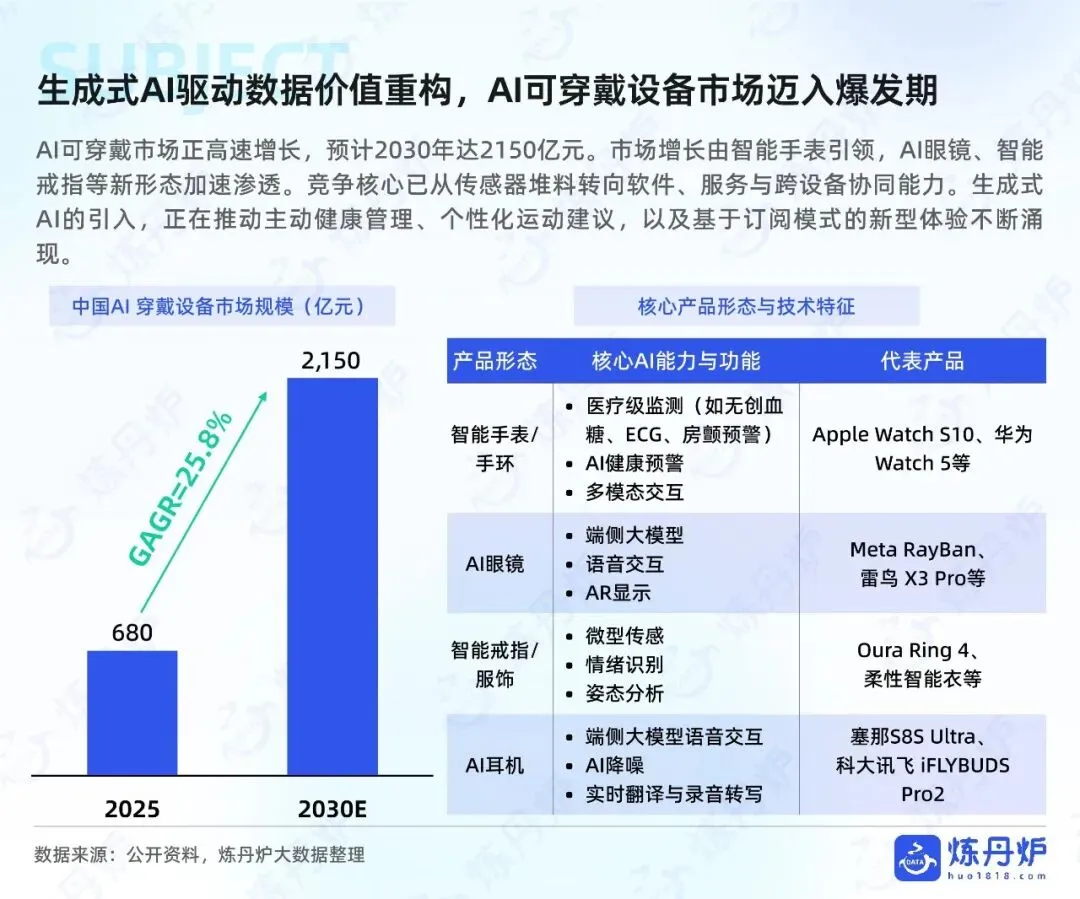 AI可穿戴市场预计2030年达2150亿元,由智能手表引领,AI眼镜、智能戒指等新形态加速渗透。竞争核心从传感器堆料转向软件、服务与跨设备协同能力,生成式AI推动主动健康管理、个性化运动建议及订阅模式新型体验涌现。