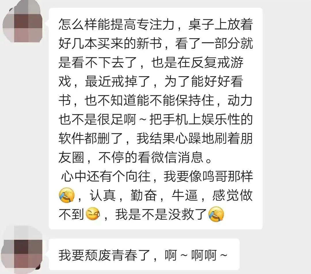各种吸睛的字眼、刺激、猎奇的信息,无时无刻不在占据你的视野。如果你拿着别人的手机一对比,会发现,在每个人的手机上,推送的信息是不一样的。在人工智能越来越聪明的时代,你每一次搜索、评论、点赞,甚至是在某个视频多驻足10秒,都会被大数据抓取,存入数据库。系统会分析你的喜好,然后给你推送你感兴趣的东西,这些信息,都是为你量身定做的。所以啊,越来越多的人沉迷手机,每天什么都不想做,把大量的时间花在各种APP上。周末的时候打算学习,却总是下意识的打开手机,追剧、刷短视频;晚上叫上同学开黑,在游戏里大喊大叫,直到手机没电。一开始,我觉得是自己自控力差,贪玩,后来我发现,我错了。真正的原因是:一个人习惯了高刺激的环境,就很难适应低强度的刺激。你习惯了业余时间玩游戏,即使有一天把游戏卸载了,也只会去刷短视频,而不是去阅读。你过惯了追剧的日子,即使戒掉了,也会打开热搜,吃各路瓜,而不是去图书馆自习。你忘却了现实世界的烦恼,那不如意的生活,揪扯不清的人际关系,都抛到九霄云外了。你感受到了巨大的失落感,开始变得心烦意乱,总想着干点什么。因为你已经习惯了这种高强度的刺激,一脱离这种环境,就会像热锅上的蚂蚁一般,焦躁不安。于是,为了重回高刺激的「怀抱」,你习惯性的拿起了手机,在各种APP之间欢呼雀跃。然而问题是,你越沉迷游戏、视频、小说,内心便越空虚,于是形成了恶性循环。当你习惯了手机上各类信息的高频刺激,你会变得越来越急躁,越来越没耐心去做一件事了。原因很简单啊,你的注意力都被这些高频刺激的信息给捕获了。在这样的环境里,你每触碰一次屏幕,每点击一个按键,都会立即给你反馈结果,你已经对即时反馈形成了「路径依赖」。久而久之,你的心态也被「训练」成急功近利,追求短期速成。所以,当你的注意力从某个高频刺激的对象移开时,只会转移到另一个高频刺激的对象上面。比如说,你玩了几小时游戏,直到强制休息,这个时候,你是很难静下心来学习的。因为学习对你来说是程度很低的刺激,你根本没那个耐心。即使你强迫自己学习,也很难专注,还是会转移到高频刺激的事物上面。不信你看看下面这位读者,反复的「安装—卸载」游戏,也很难静下心来看书。即使他把所有娱乐软件卸载了,注意力也只会从游戏转移到朋友圈。回想一下,你已经多久没有心平气和的坐下来,看一本书,或者思考一件事了。一个沉迷手机的人,他已经适应了高刺激的环境,那么他对阅读、学习这类事情是非常排斥的,只会对娱乐信息感兴趣;一个持续学习的人,没有被高频刺激的事物提升阈值,他仍然能接受低频刺激,所以业余时间,他一直坚持学习、思考。沉迷手机的人,他的人生越来越不值钱,逐渐被社会淘汰。而持续学习的人,他的思考能力、认知水平、见识格局都碾压前者,他们的差距会越来越大。在这个心浮气躁的时代,能够静下心来阅读长文的人,比那些只关注15s短视频的人,大概率要优秀。一个人所处的生活环境,会对他的生活习惯造成决定性影响。但我想说的是,千万不要被这些信息「塑造」成高频刺激的敏感体质。凡事得有个度,你的时间应该放在对你人生长期有益的事情上面。我在前面说过,当一个人习惯了高强度的刺激,就很难去做低刺激的事。确实如此,但如果这件低刺激的事,刚好是你感兴趣的,那么结果又会不一样。比如说,高三的时候,我沉迷小说,而且很讨厌上物理课,所以,一上物理课我就看小说。后来,换了一个物理老师。这位老师画图画得特别好,所以每次上课,我就在草稿上模仿他。情况开始改变了,我戒掉了小说,喜欢画图,而且喜欢上物理课,高考的时候,物理是我考的最好的一门。所以,如果你喜欢听歌,那么在某个周末,戴上耳机,绕着校园走一圈。你喜欢爬山,那么叫上三五好友,一起享受登上顶峰的成就感。必须要承认,追求安逸享乐,这是人类刻在骨子里的本性。而学习、思考,总是与人性背道而驰的,但先甜后苦,还是先苦后甜,确实需要自己拿捏清楚。每个人都应该为自己的人生负责,是选择继续用手机填补内心的空虚,还是走出这种状态,全看自己。作者简介:小鸣,知乎签约作者,个人成长领域20w粉丝答主,现在是一家文化传媒公司创始人,想带你一起精进!本文转载自公众号:张小鸣(ID:zxming2021),转载请联系原作者授权。