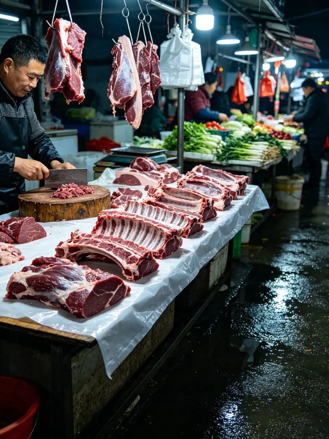 内容简单到不能再简单:凌晨5点的菜市场,镜头对着一整扇牛肋骨,AI配的字幕:“凌晨5点,常州最早起的面馆老板,只为这一锅汤。”