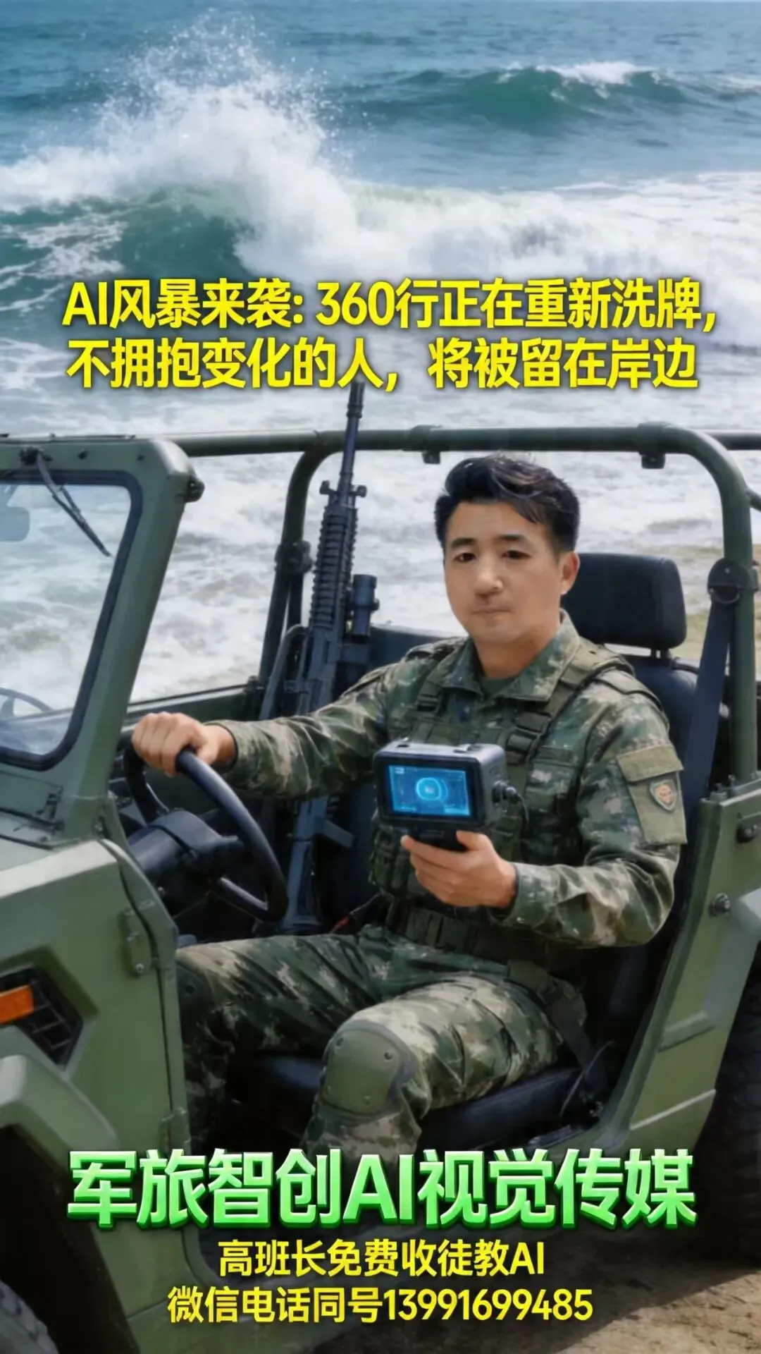 身边有位做“军旅情怀图文视频智创”的同行,堪称洗牌中的突围者。他没有因为AI兴起就放弃深耕,反而主动研究AI与军事题材内容的结合,用AI生成高清场景、优化视频质感,同时保留自己对军旅情怀的深度理解。
