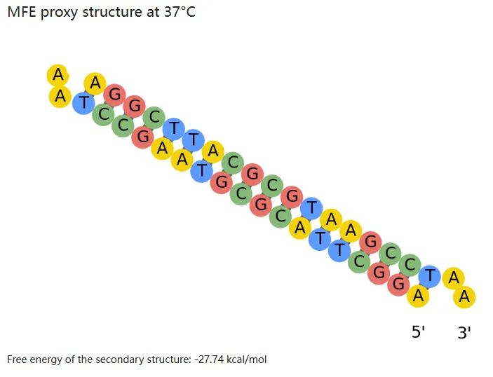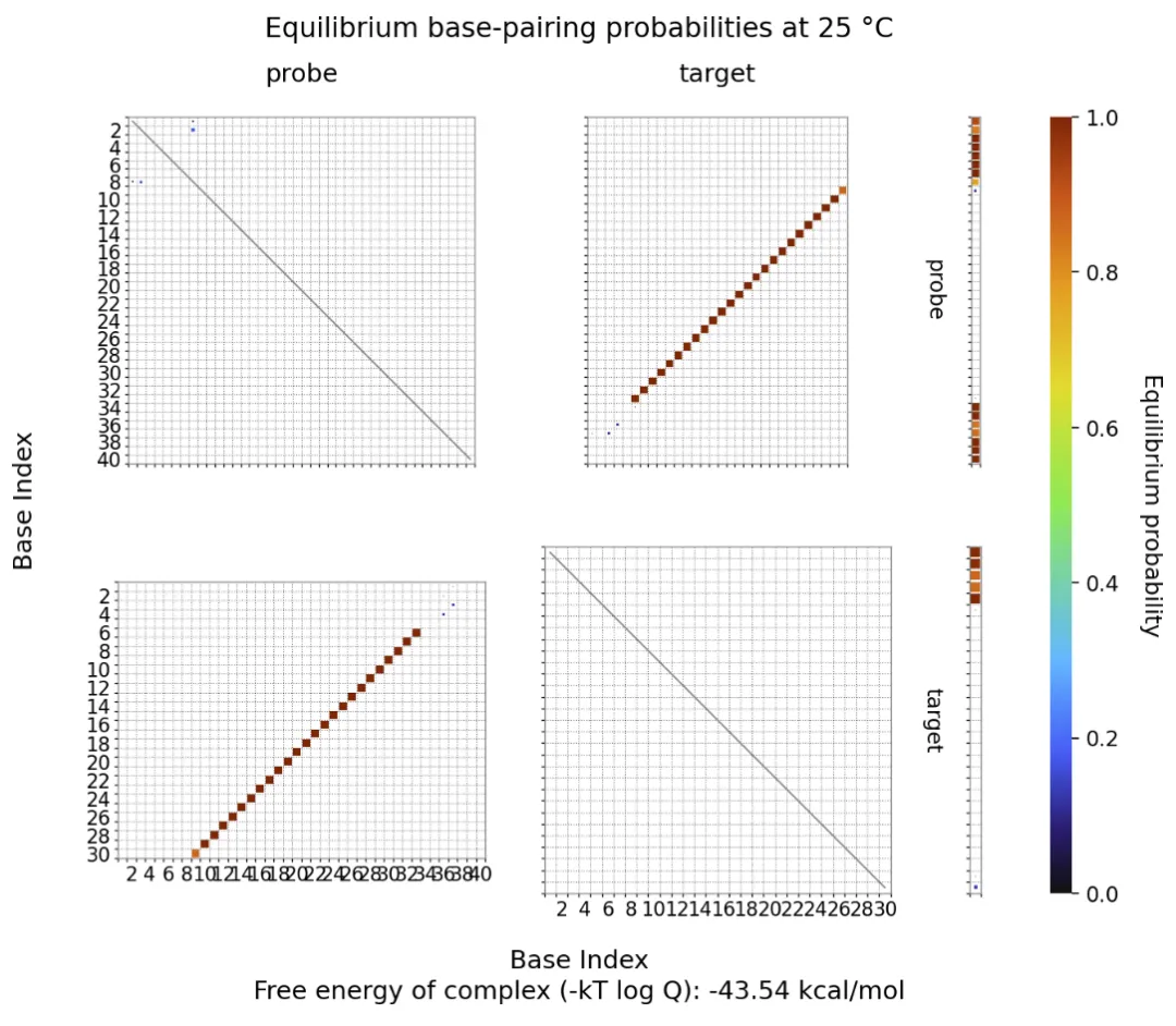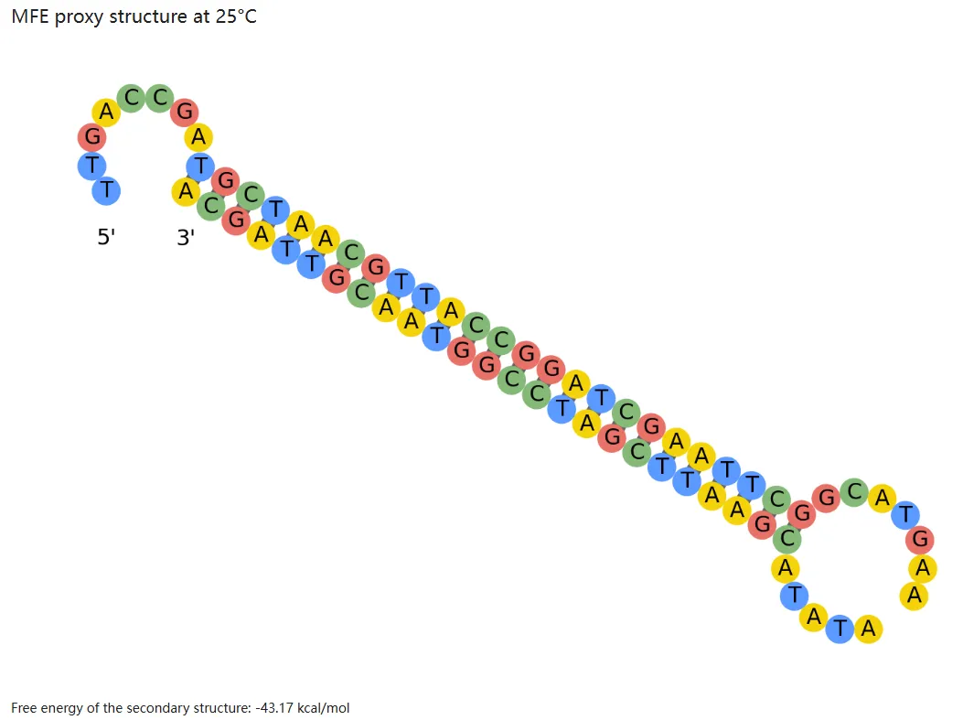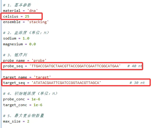 需求:一条链40 nt,一条链30 nt,中间25 nt互补,各1 uM。温度25摄氏度,钠离子浓度1M。