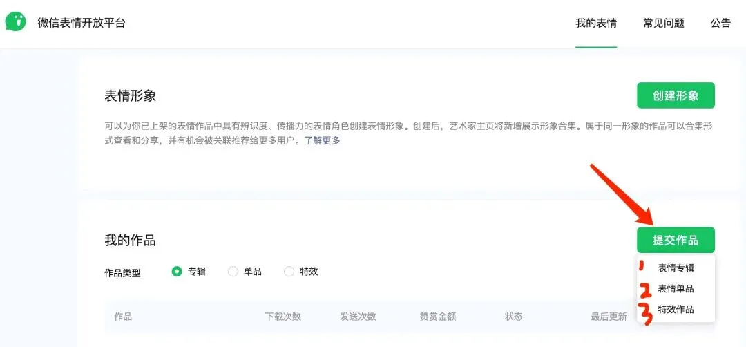 2、用微信扫码登录,在提交作品板块中,选择你要上传的作品类型,直接选择「表情专辑」即可。