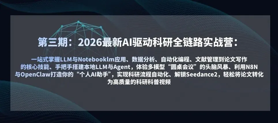 🌟 课程一:2026最新AI驱动科研全链路实战营:贯通LLM与Notebooklm应用、数据分析、自动化编程、文献及知识管理、科研写作与绘图、构建个人AI助手与科研工自动化作流培训班