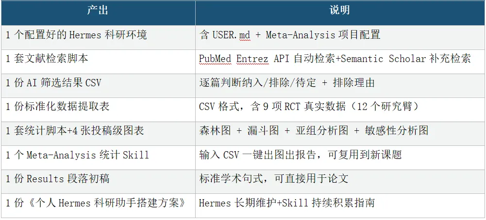 5.带走你的专属科研智能体:你将带走一个配置好的Hermes Agent和Meta-Analysis统计Skill,利用其自进化能力,未来可一键复用到你的任何课题中。