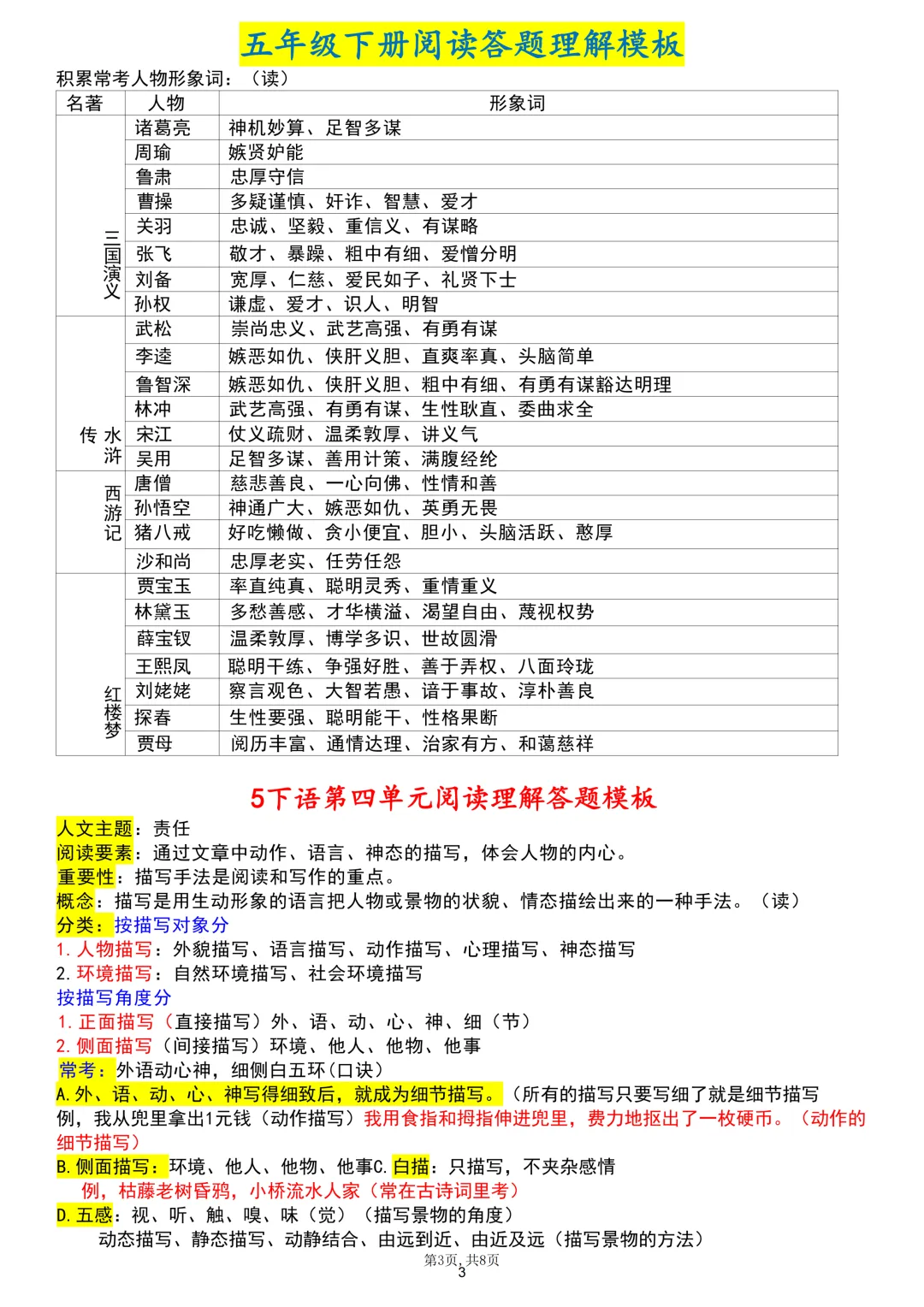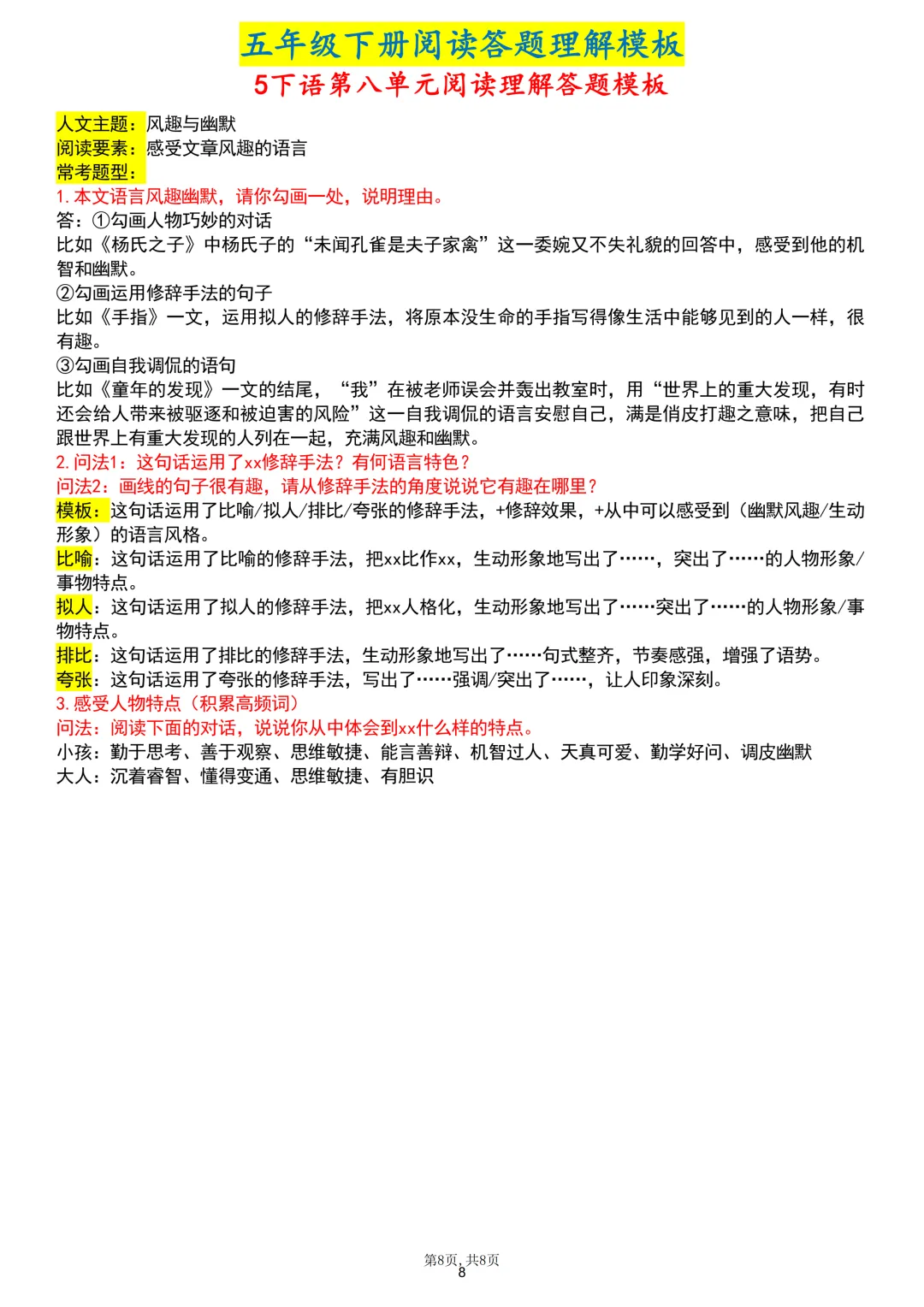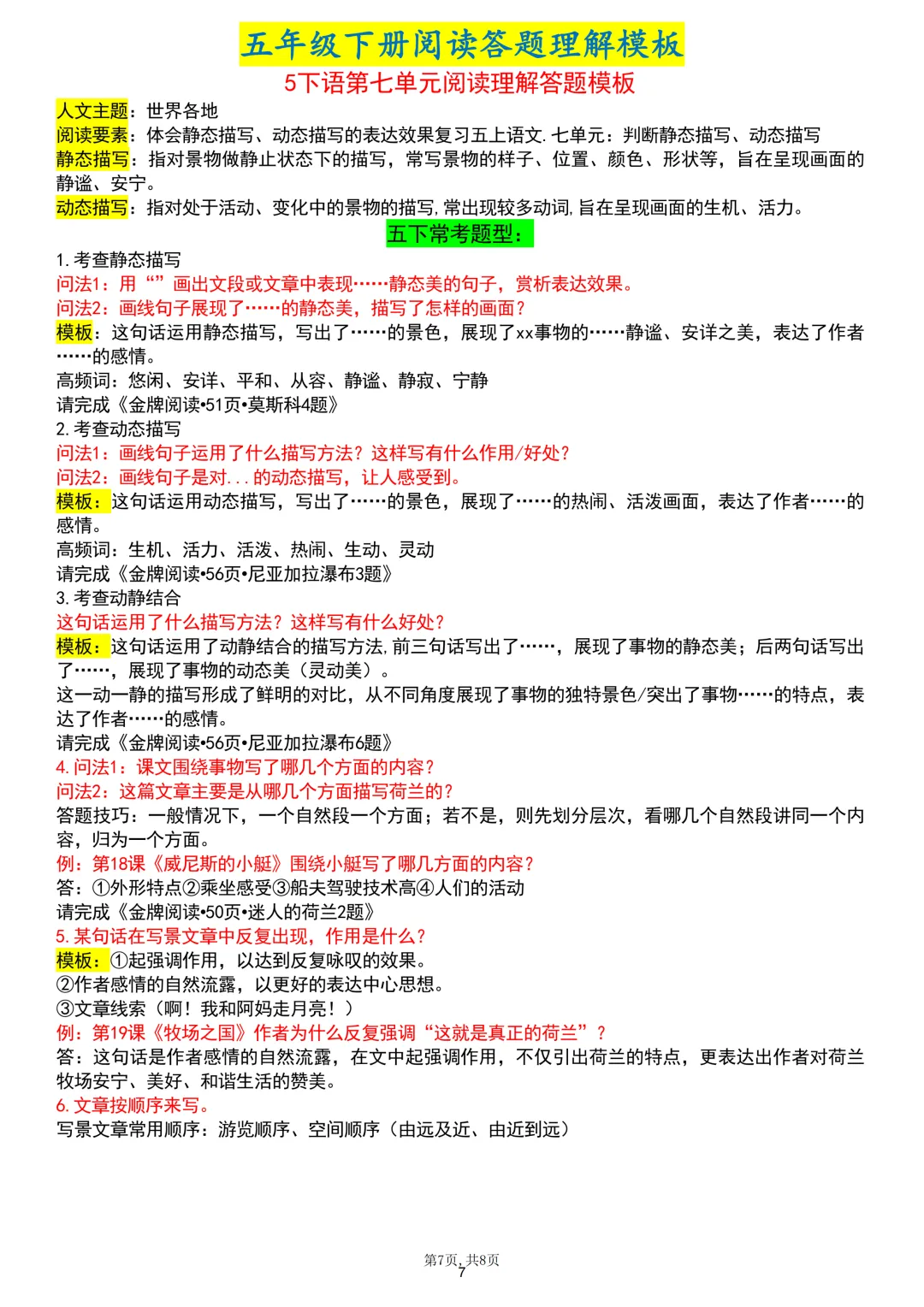 本篇专门整理五年级下册阅读理解答题模板,贴合课本单元考点,句式规范、简单好记,孩子平时练习、期中期末都能用,家长赶紧收藏,帮孩子少走弯路、快速提分。