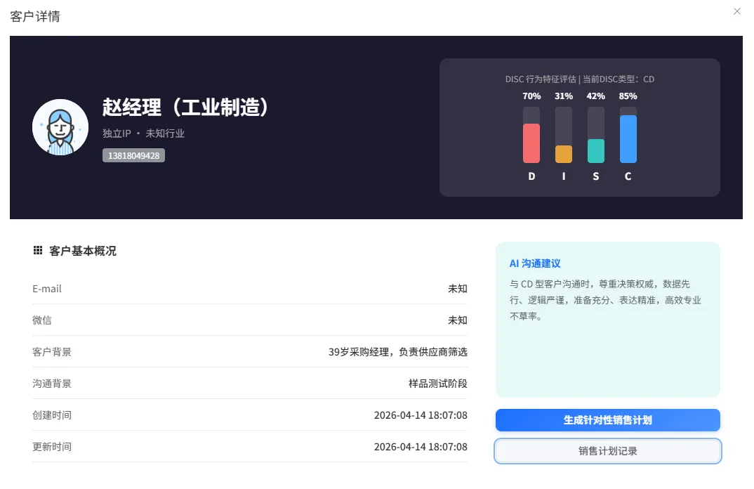 对应70%倾听环节的核心需求,基于DISC百年学术理论,依托3000万+行为数据、1000+岗位模型,帮你一键建立结构化客户档案,自动完成客户人格画像分析,精准捕捉客户的重复关键词、情绪变化、潜在需求,让你不错过任何一个成交突破口,哪怕是销售新人,也能拥有销冠级的痛点捕捉能力。