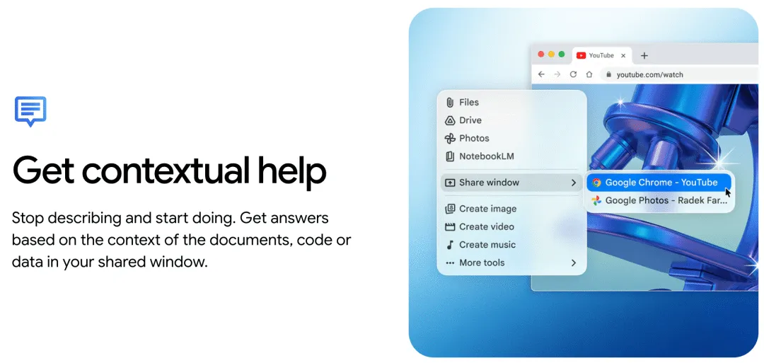 共享当前窗口内容,Gemini 可以基于用户正在查看的文档、代码、图表等内容提供上下文相关回答;