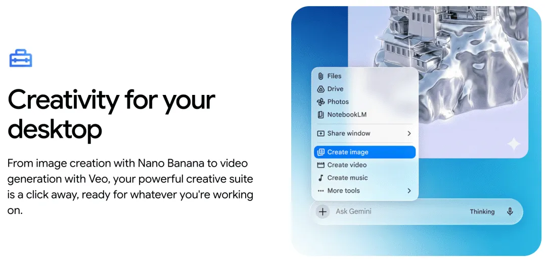 今天,Google 在官网上线 Gemini for Mac,宣布推出面向 macOS 的原生桌面应用。与此前主要依赖网页端不同,这次 Gemini 支持 全局快捷键唤起(Option + Space)、窗口共享获取上下文,并可在桌面端快速调用图像、视频等生成能力。