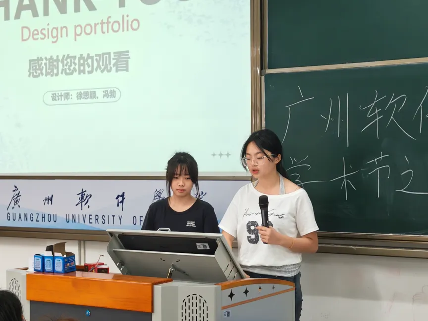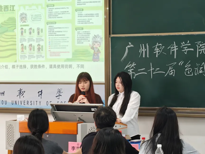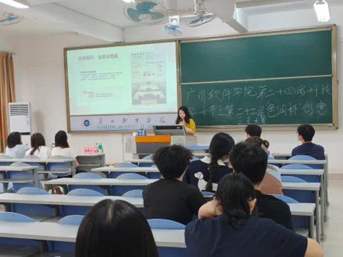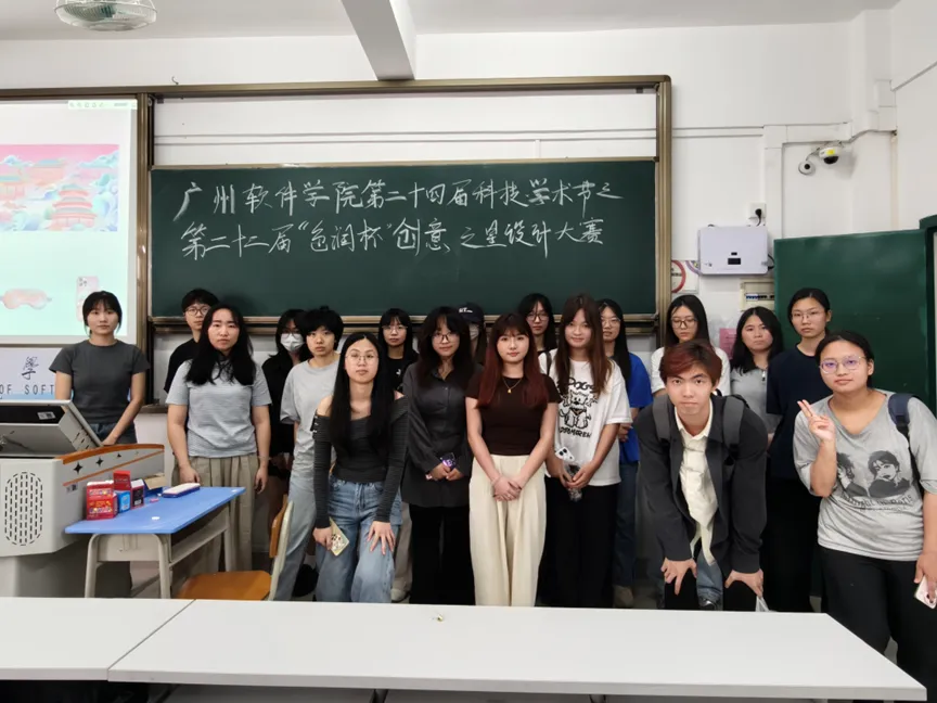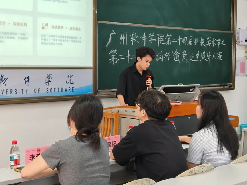 本网讯丨2026年4月,广州软件学院创意设计学院分别在U301、U302教室举办第二十四届科技学术节暨第二十二届“色润杯”创意之星大赛答辩环节。经过前期层层选拔,十支优秀团队脱颖而出,进入最终答辩环节。本次赛事特邀创意设计学院赖嘉容老师、王维老师、张诗喻老师、赖乐娴老师、欧茂阳老师、李若萌老师,六位资深专业教师组成评审团,全程负责赛事评审与专业指导工作。