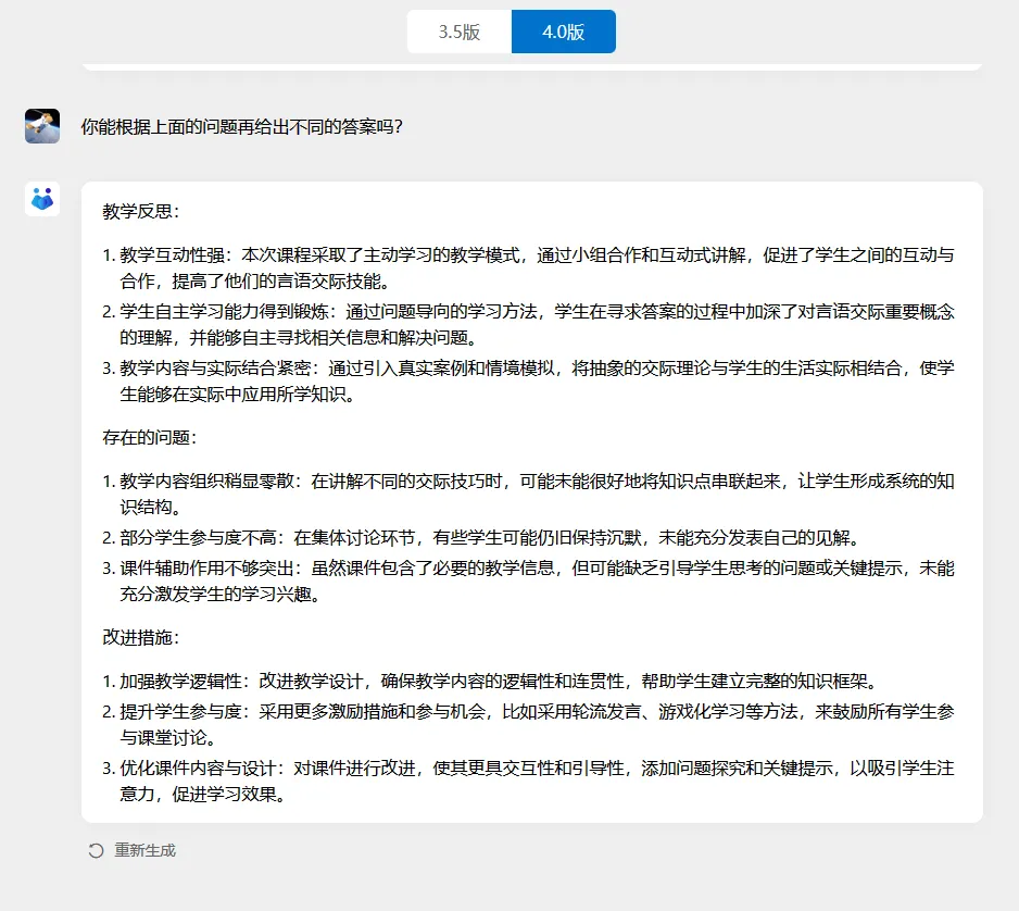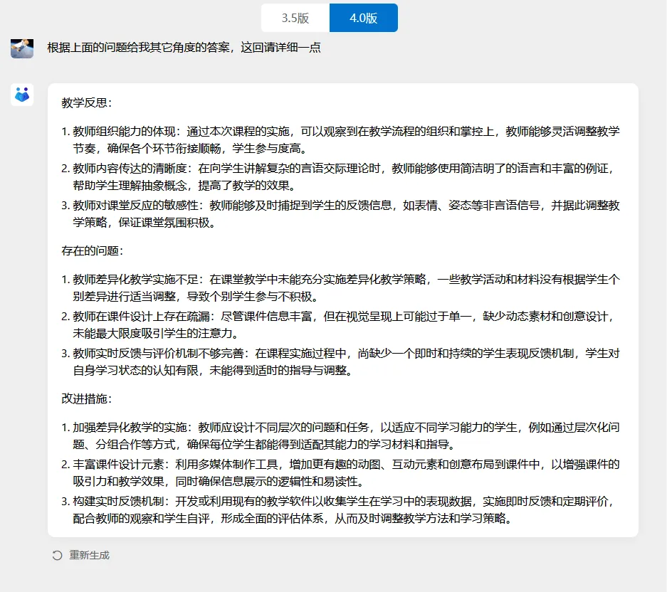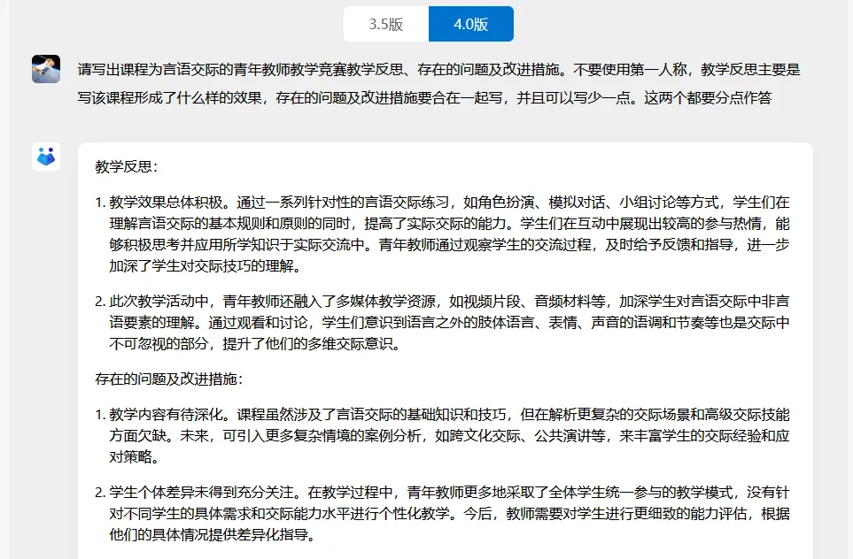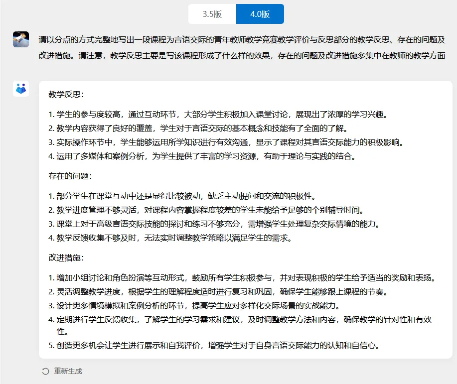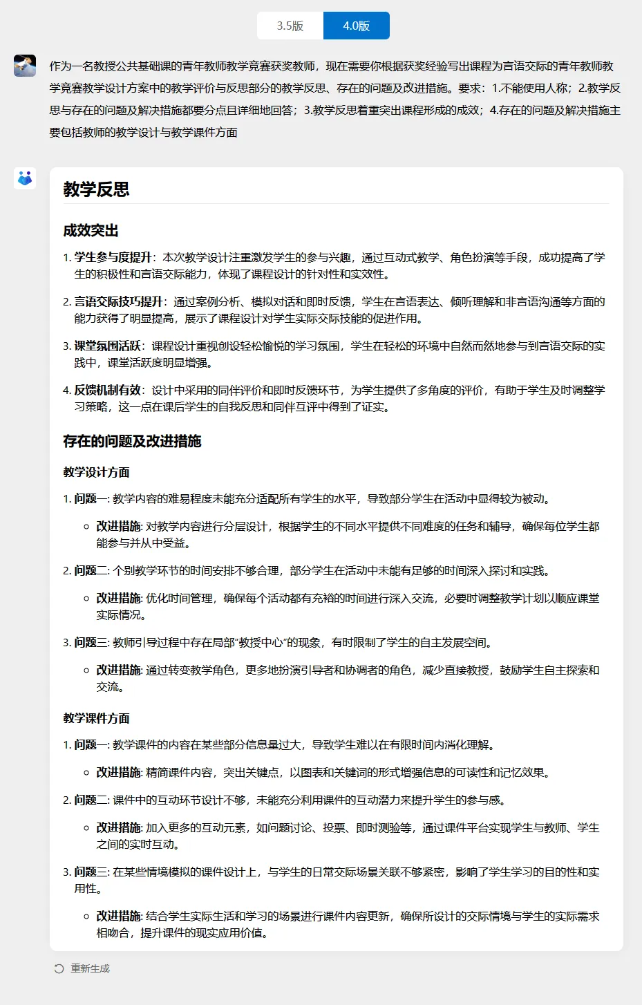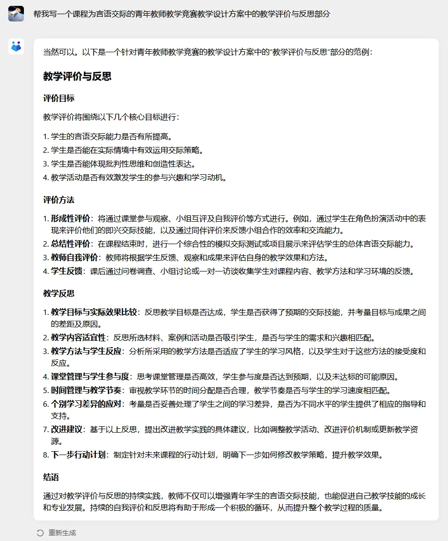 以青年教师教学竞赛的教学设计方案为例,它包括基本信息、教学背景、教学策略、教学实施、教学评价与反思等五个部分。今天我们就以教学评价与反思部分为例,来看看AI是怎么写的吧!