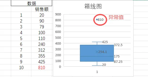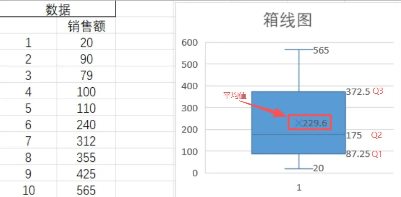Excel-40(箱线图)可以快速发现一组数据的分布情况,判断是否有异常值。我们直接看下面的例子,左边是数据,右边是箱线图。箱线图里,有体现一个概念,四分位数。四分位数是将数据从小到大排序,用3个点将数据分成“数量相等的4段”。用Q1,Q2,Q3分别为下四分位数、中位数、上中位数。前25%的数据≤Q1, 前50%的数据≤Q2,前75%的数据≤Q3。箱型图,四分位距IQR=Q3-Q1,用来衡量数据“中间50%的波动大小”,来定义异常值。IQR的值越大,这个箱体越长,说明这组数据越分散。箱体越矮,数据越集中。