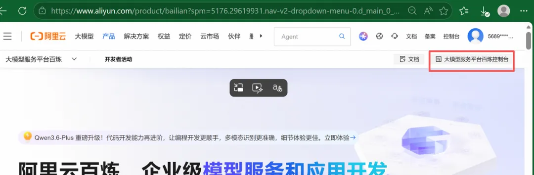 登录成功后,在阿里云官网的搜索框里搜"百炼",点击进入"大模型服务平台百炼控制台"。
