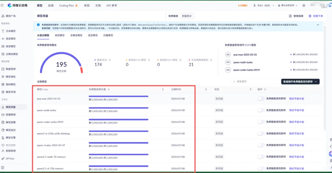 在这里,你可以清楚地看到,阿里云给新手赠送了哪些模型的免费额度。额度非常够新手用。