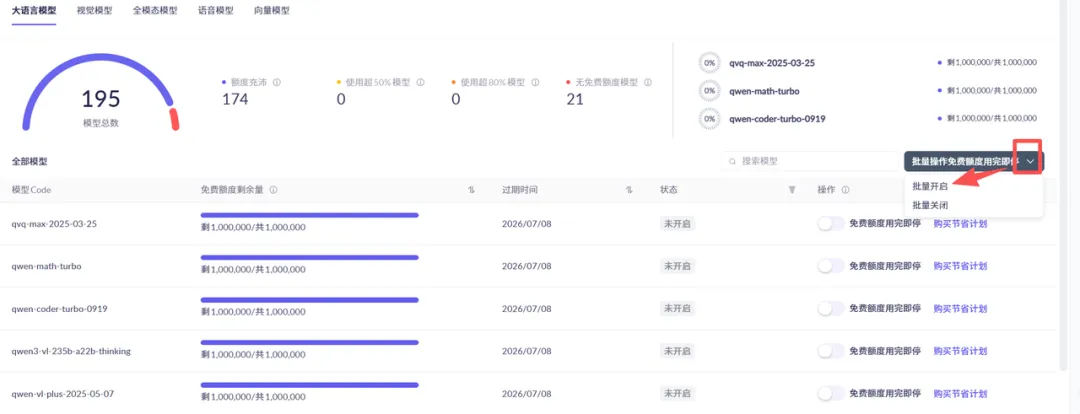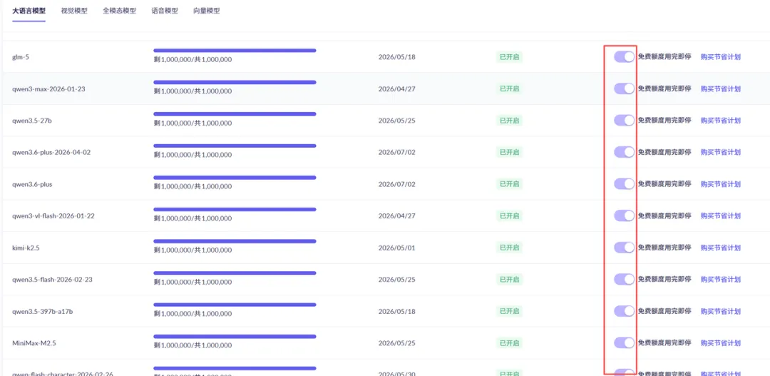 在模型列表里,每个模型后面都有一个【免费额度用完即停】的开关。请务必!每一个!都!手动开启!