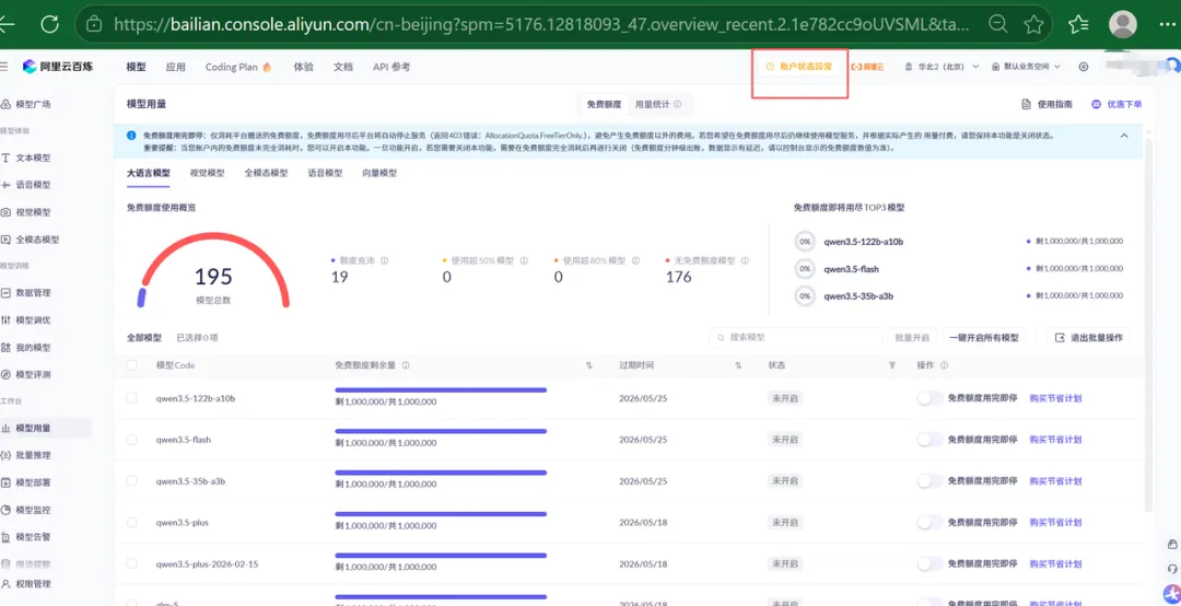 我赶紧去看,发现就这一句话,因为没开"即停",直接把某个模型的免费额度超了,开始扣我账户里的余额(或者直接显示欠费)。