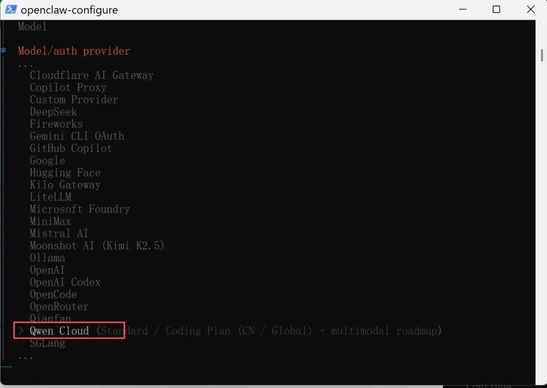 在供应商列表里,找到并选择"Alibaba Cloud Model Studio(阿里云)"。