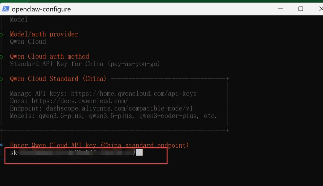 把你刚才保存在记事本里的 Key 复制,然后回到终端,直接点击鼠标右键,Key 就会粘贴进去(屏幕上可能不显示,这是正常的)。