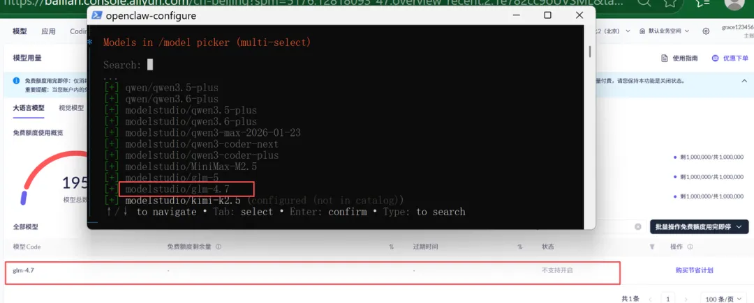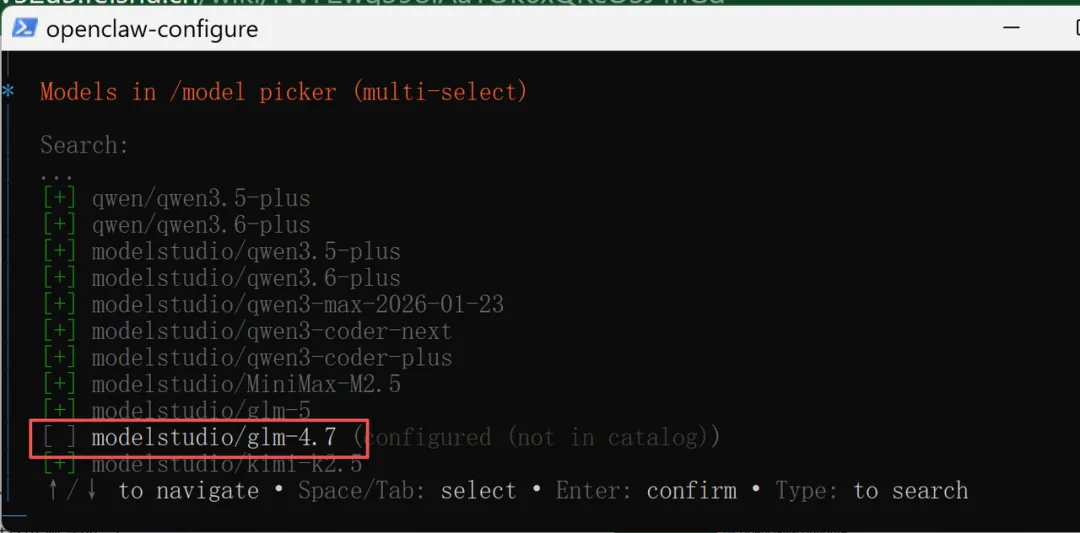 这个glm-4.7没有额度,我需要通过空格键把它改成不选中状态: