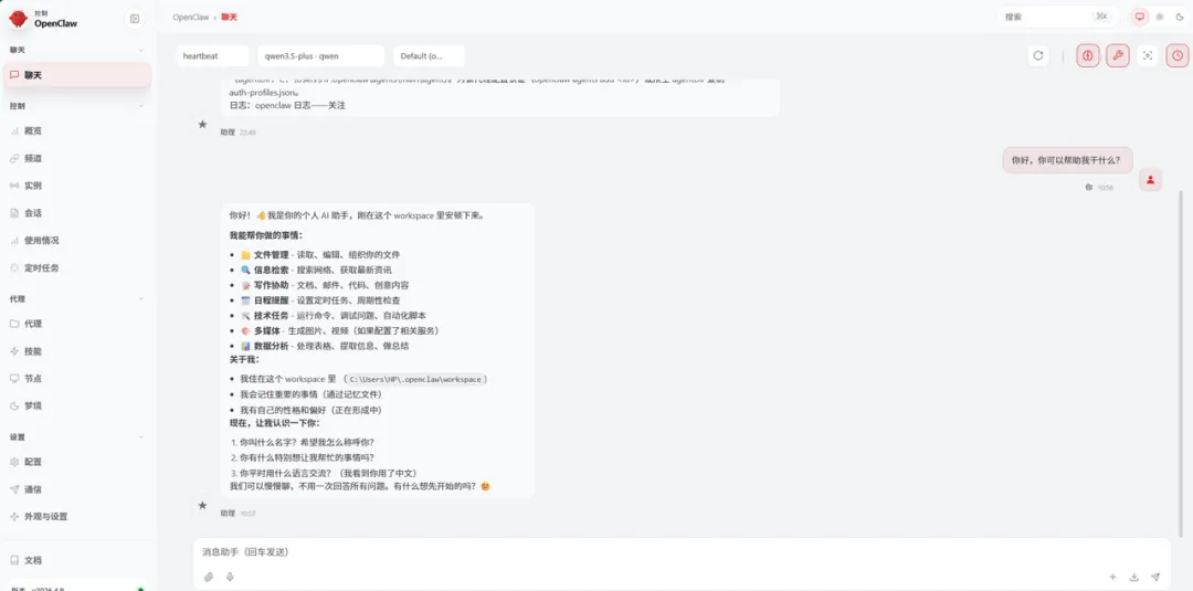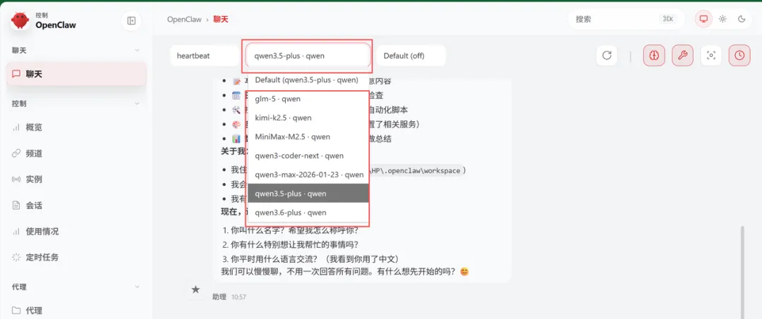 现在,随便选一个模型,再跟你的龙虾打个招呼,问问它: