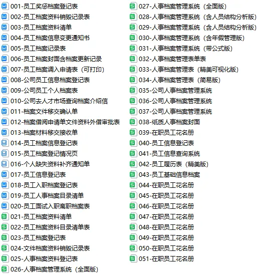 《人事档案管理》资料包内含员工档案信息登记表、员工档案资料清单、档案文件移交确认单、档案缺失资料补齐通知单、员工档案封面、员工人事档案自带公式管理表格、在职员工花名册、档案资料销毁登记表、档案调阅申请单、档案调入申请单等,共计51份文件。