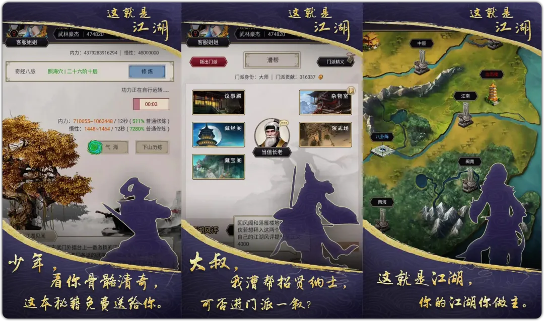 高自由度文字武侠梦!以水墨风呈现的文字武侠RPG,玩家化身江湖侠客,千门百派、十八般武学任意选择,游历江湖、解锁奇遇。放置挂机就能探索秘境,搭配快意恩仇的武侠剧情,沉浸式体验江湖人生。摸鱼时挂着机,就能解锁武林秘籍,闯出自己的江湖路!