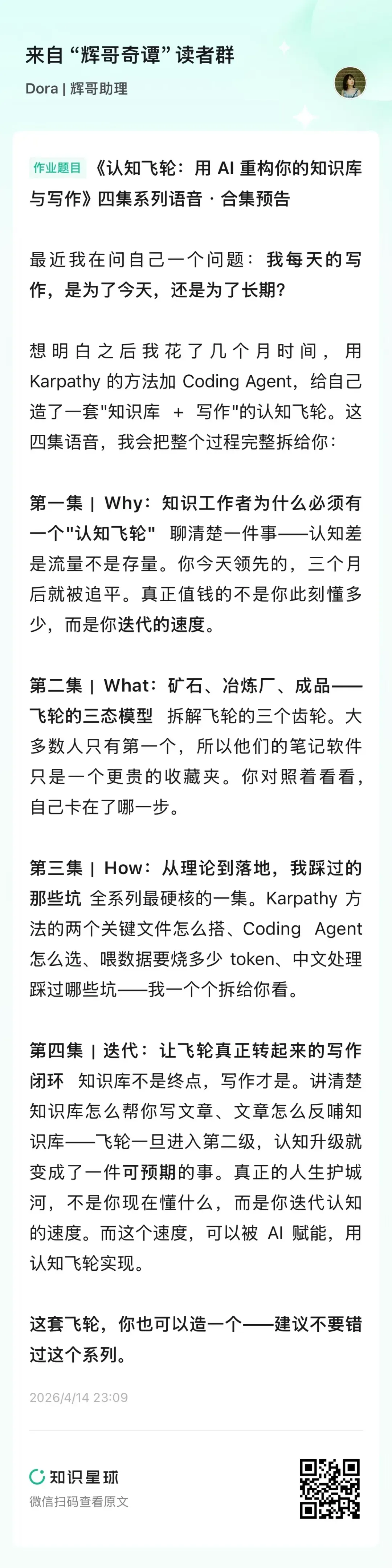 我在「辉哥奇谭知识星球」里做了一套「认知飞轮」系列语音,核心只讲一件事:怎么把每天零散的使用、零散的尝试,变成一个会自己转起来的结构。里面我拆了三个关键问题:什么该被记录,怎么被调用,以及怎么让它随着时间越来越快。