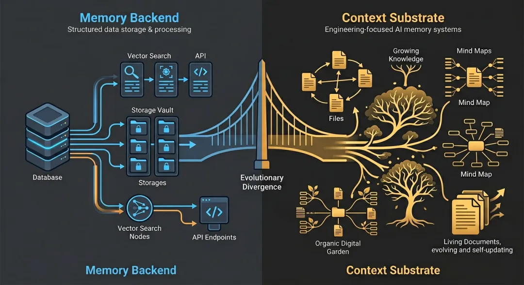 一边是记忆后端(Memory Backends),把记忆当成数据库存取;另一边是上下文基底(Context Substrates),把记忆当成活着的、不断生长的环境。