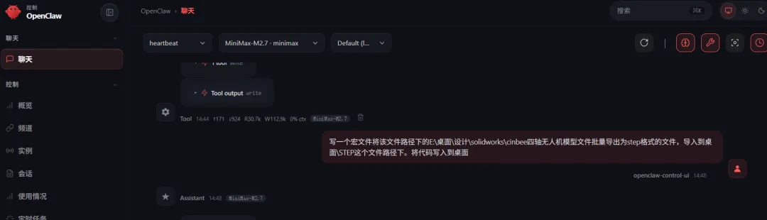 步骤三:使用自然语言让openclaw生成批处理的VBA代码,并写入到指定的文件路径下