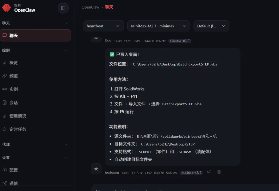 OpenClaw一键生成SOLIDWORKS可执行VBA 代码文件