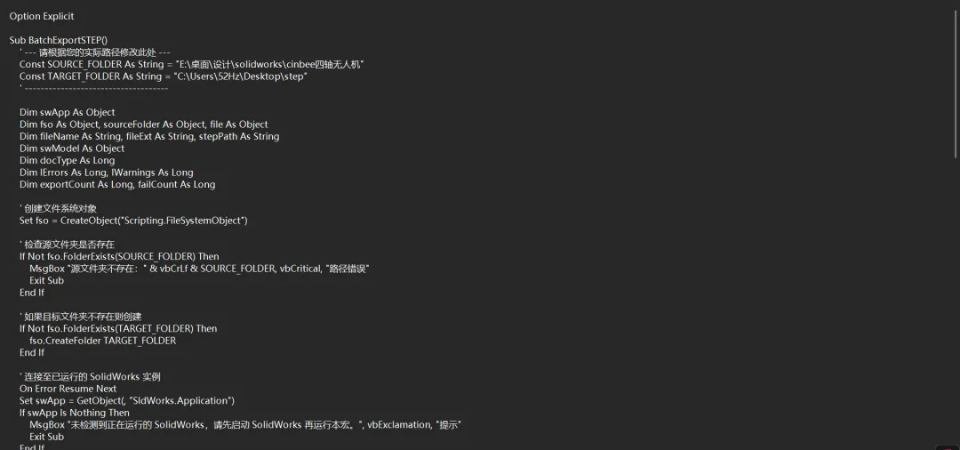 写一个宏文件将该文件路径下的E:\桌面\设计\solidworks\cinbee四轴无人机模型文件批量导出为step格式的文件,导入到桌面\STEP这个文件路径下。将代码写入到桌面。