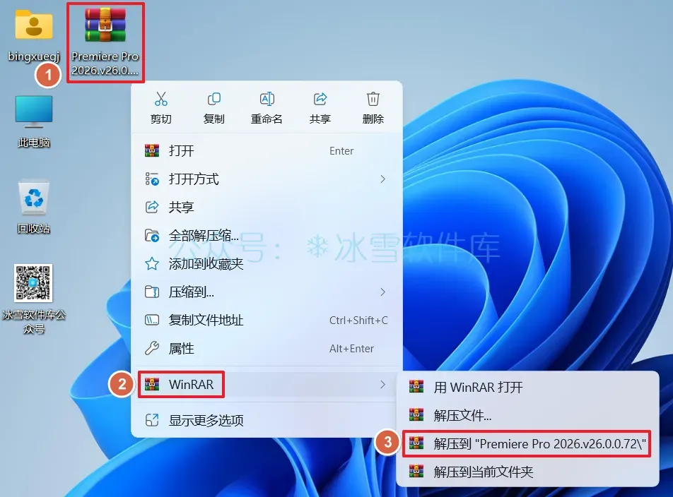 1.解压安装包:鼠标右击【Premiere Pro 2026.v26.0.0.72】压缩包,选择电脑上安装的解压软件,点击【解压到 Premiere Pro 2026.v26.0.0.72】。
