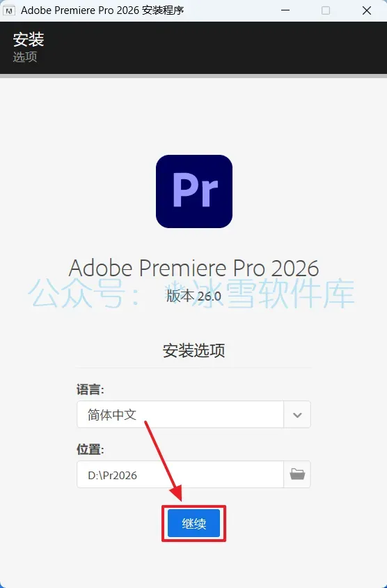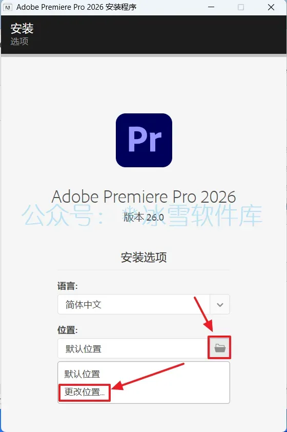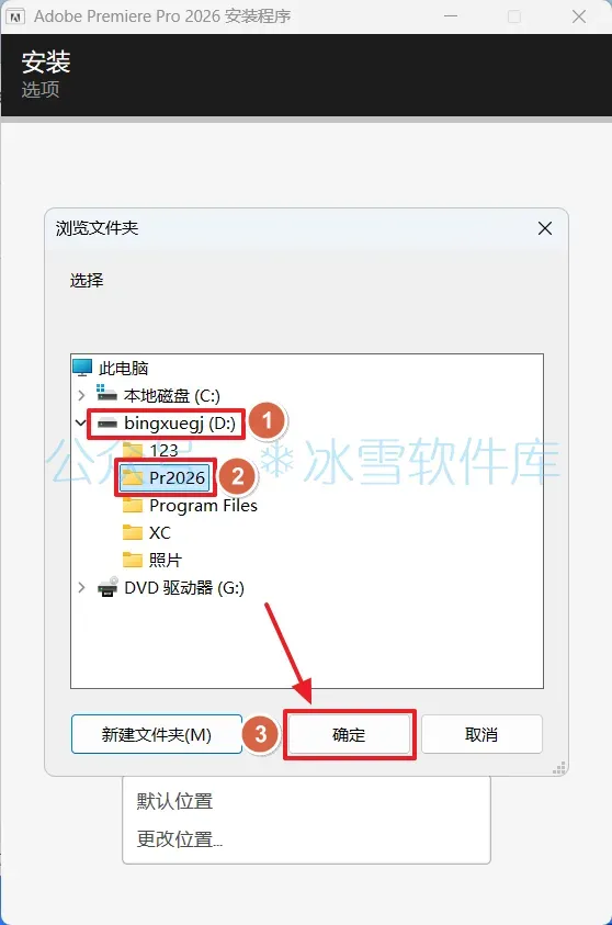 4.修改安装位置:①点击需要将软件安装的磁盘位置(如:D盘),②新建一个【pr2026】文件夹并选中,③点击【确定】。