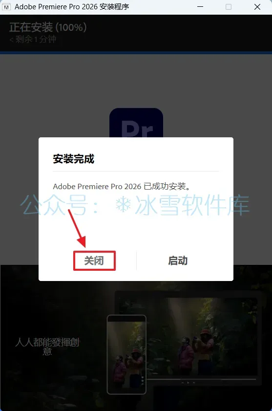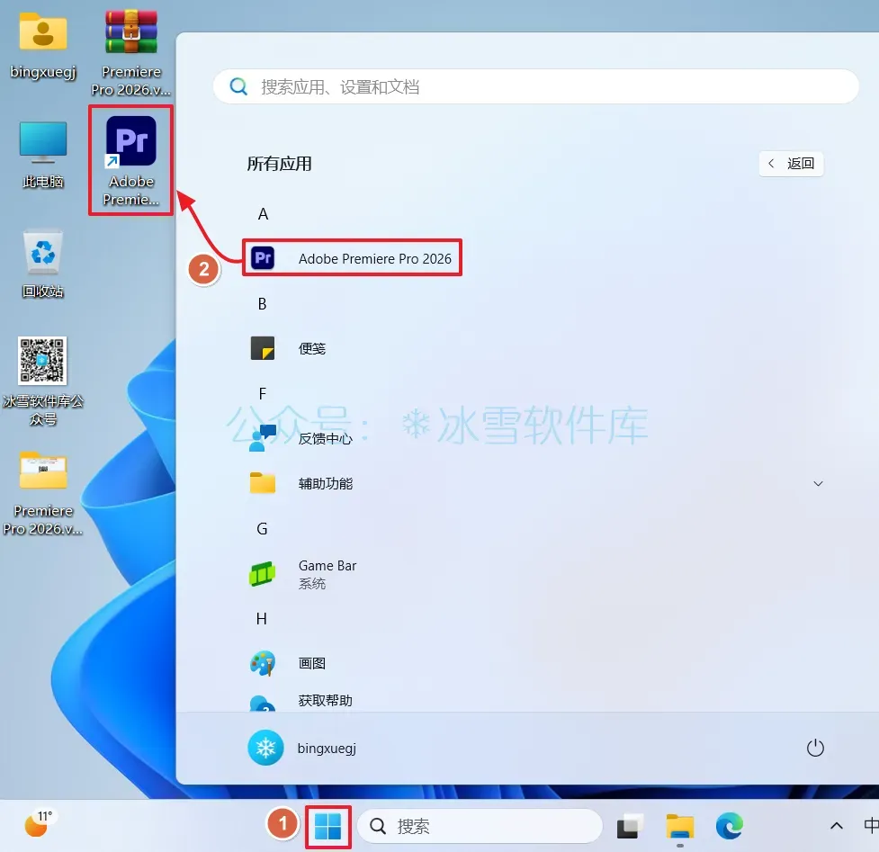 8.创建桌面快捷方式:①点击桌面任务栏中的【开始图标】>点击【所有应用】,②将【Adobe Premiere Pro 2026】图标拖到电脑桌面。