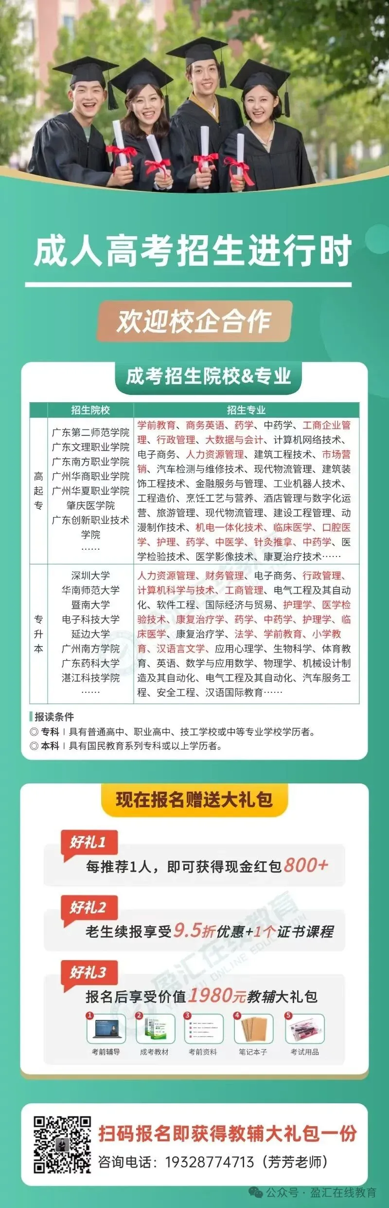 招生咨询热线:黄琙顺 199-2659-4813 (工作日9:00-18:00),官方微信公众号“盈汇在线教育”实时更新政策解读。