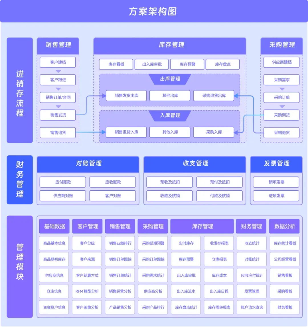进销存是配套功能,不是核心。库存逻辑复杂的公司会不够用,和其他系统的对接能力也有限。