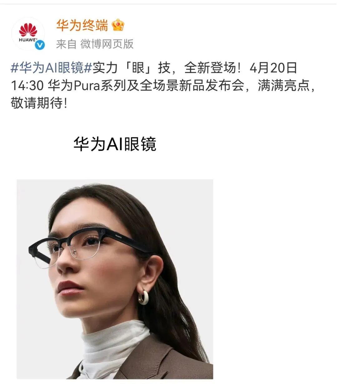 华为终端正式官宣,将于4月20日的发布会上推出首款AI眼镜。该产品采用无屏幕轻量化设计。