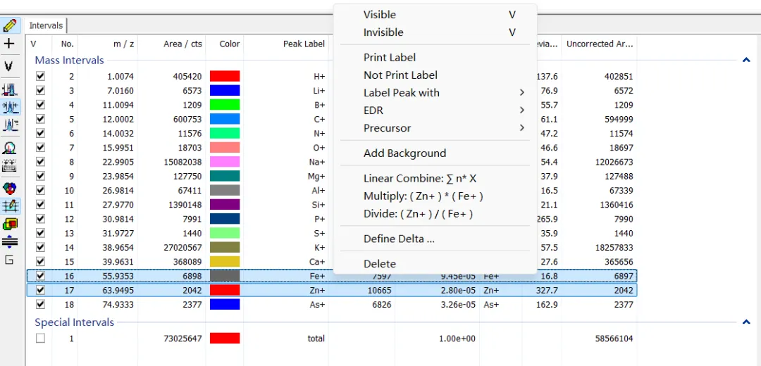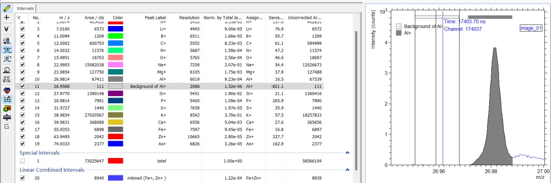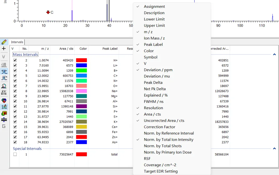 在TOF-SIMS的数据分析过程中,最开始就要先建立一个集合了我们感兴趣的特征离子的mass interval list。这个在Spectra program中实现,且配置了很多实用的功能。本文主要针对mass interval list的使用和功能进行讲解。