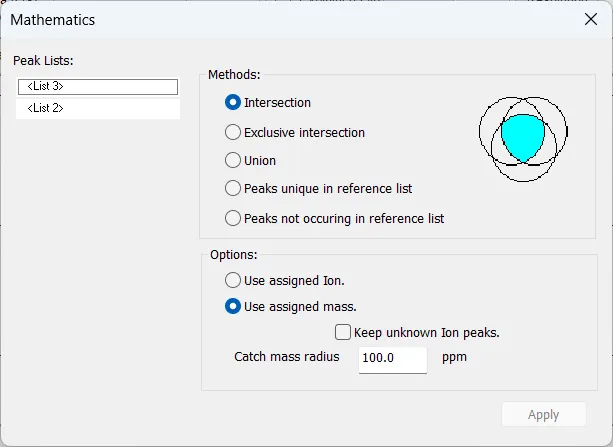 可以实现peak list的交集、并集、差集、补集等操作。可以通过菜单栏上“Peak List”菜单下的“Mathematics...”,或峰列表区域左侧工具图标来打开窗口。