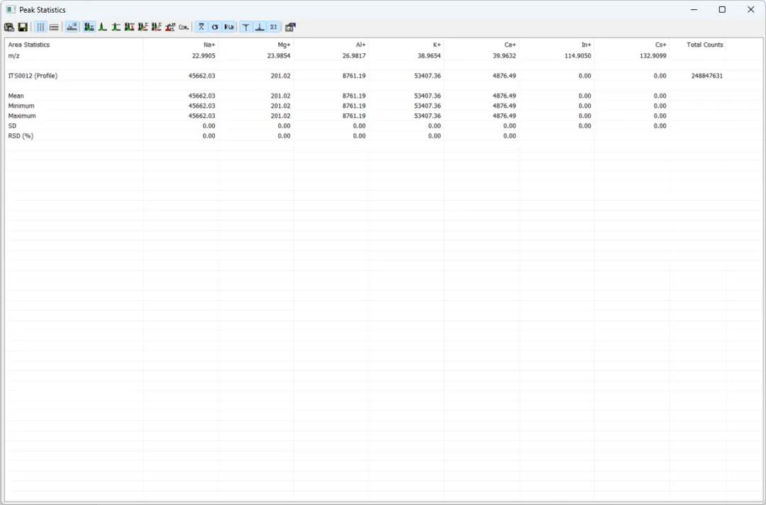 该功能可以对数据依据当前的峰列表进行简单的统计分析,其中较为重要的就是峰列表中每个离子对应的峰面积以及针对峰面积得出的标准差等统计数据。