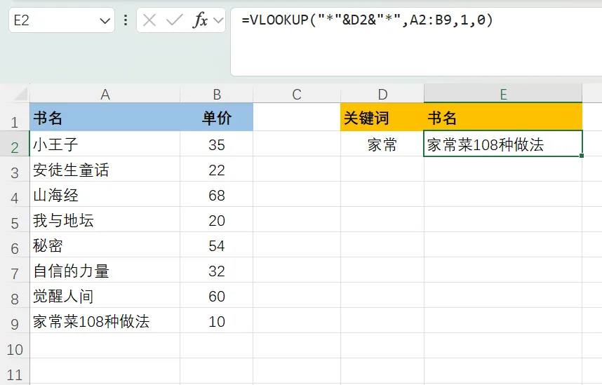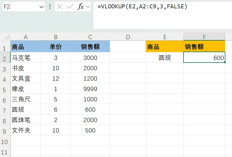 =VLOOKUP(E2&F2,IF({1,0},A2:A9&B2:B9,C2:C9),2,0)。