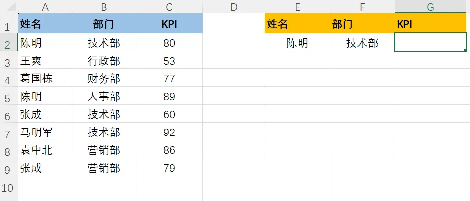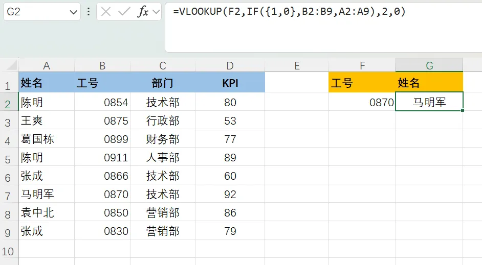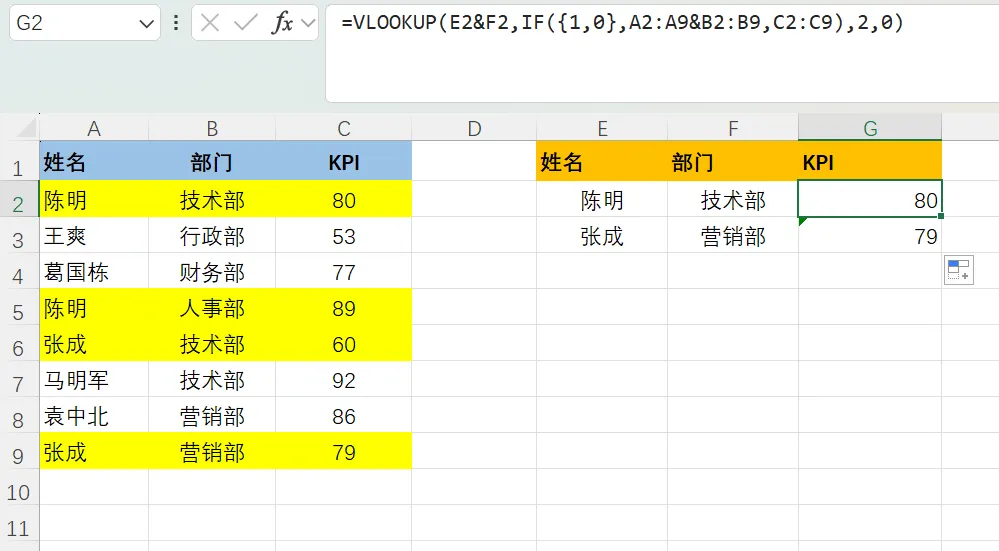 VLOOKUP函数也可以做到多条件查询,比如以下这种,多个部门之间有同事重名的情况,统计KPI的时候该怎么办?我们可以设置公式为:
